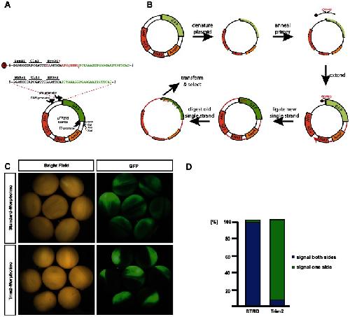 Figure 2. Standard primer for SOMA-construction of a GFP reporter (A).Phosphorylated primer (red P) with diagnostic EcoRI site (red C; EcoRI*), 23 bp of GFP (green sequence) and morpholino target sequence in frame with GFP (NNN)x including ATG (red sequence). Green fluorescent protein (GFP) gene (green); ampicillin resistance gene (AmpR; yellow); URA3 gene, yeast centromere (CEN), autonomous replication sequence (ARS) (red). Schematic outline of the SOMA method for production of GFP reporters (B). (1) denature pTP218; (2) 5′ phosphorylated single primer anneals; (3) primer is extended to the 5′ end; (4) nicks are ligated; (5) template strand is digested with DpnI; (6) mutated single stranded plasmid transformed into E. coli and positive clones identified by lack of EcoRI site. Test of TRIM2 GFP reporter construct in vivo (C). Synthetic reporter sense RNA injected into fertilized Xenopus laevis embryos at the one-cell stage; TRIM2- or Standard (STRD)-morpholino injected into one blastomere at the two-cell stage. Visualization after 1 day by brightfield or fluorescence microscopy (GFP). 99 of total 101 standard morpholino (STRD) injected embryos showed a GFP signal on both sides (98%); 249 of total 271 Trim2- morpholino injected embryos showed a GFP signal on one side (92%) (right).