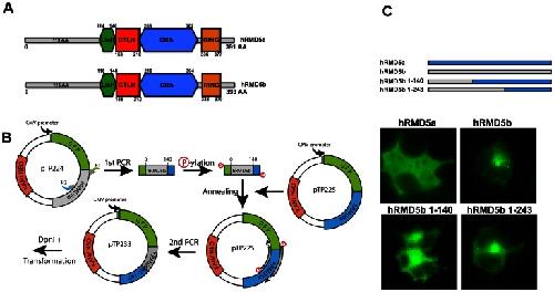 Figure 3. Restriction site independent cloning.(A) Schematic representation of two human RMND5 isoforms (hRMD5a, hRMD5b) with domains; numbers indicate amino acids. (B) Schematic outline of RMND5a/b chimera production. (1) pTP224 as template; (2) PCR with primer P1 and P2 resulting in RMND5b fragment (3) Phosphorylation of 1st PCR product. (4) 5′ phosphorylated PCR product anneals; (5) is extended to the 5′ end; (6) nicks are ligated; (7) template strand is digested with DpnI; (8) product transformed into E. coli. Green fluorescent protein (GFP) gene (green); Kanamycine resistance gene (Kan/Neo; orange); RMND5b (grey); RMND5a (blue) (C) Localization of hRMD5a (blue), hRMD5b (grey) and different hybrid fusion (blue/grey) in HEK293 cells. Length of RMD5b fragments indicated as numbers of amino acids (e.g. hRMD5b 1-140).