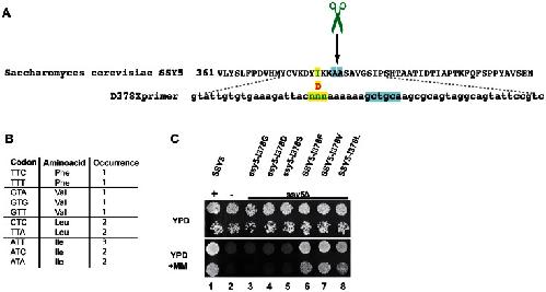 Figure 4. Generation of a semi-random mutagenized gene library using SOMA.(A) Ssy5 sequence with autolytic processing site (scissors) between A381 and A382 (blue). Replacement of conserved isoleucine378 (I; green) with aspartate (D; red) inactivates Ssy5. Primer D378X with random codon (NNN) theoretically capable of encoding all amino acids at position 378 (green). (B) Table with active D378 substitutions recovered in plasmids selected based on their ability to confer Ssy5-dependent growth on YPD+MM. (C) Dilutions of strain HKY77 (ssy5Δ) carrying pSH120 (SSY5; +), pRS316 (empty plasmid; -), I378G, I378D, I378S, I378F, I378V, or I378L.