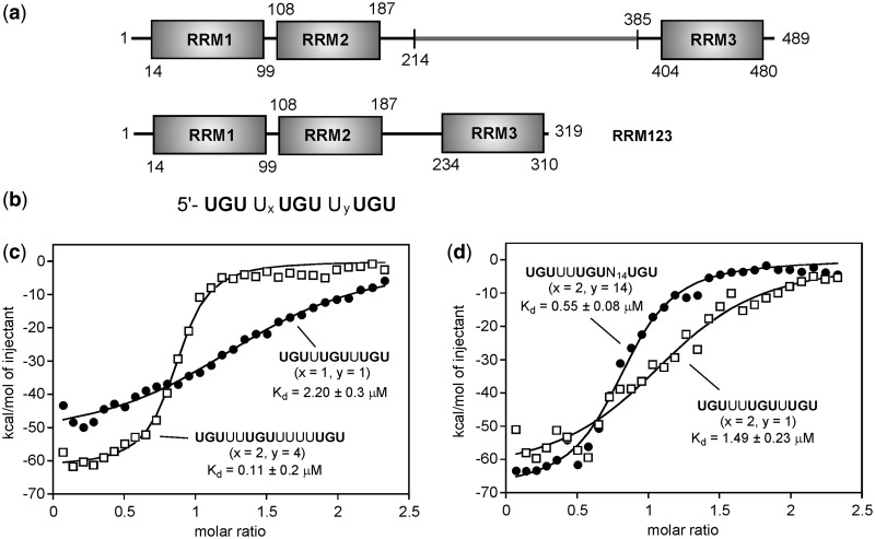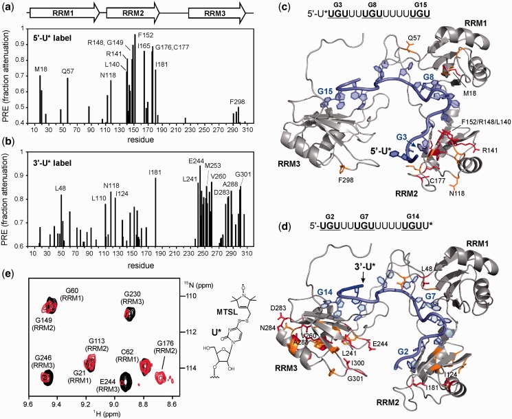 The CUG-BP, Elav-like family (CELF) of RNA-binding proteins control gene expression at a number of different levels by regulating pre-mRNA splicing, deadenylation and mRNA stability. We present structural insights into the binding selectivity of CELF member 1 (CELF1) for GU-rich mRNA target sequences of the general form 5'-UGUNxUGUNyUGU and identify a high affinity interaction (Kd ∼ 100 nM for x = 2 and y = 4) with simultaneous binding of all three RNA recognition motifs within a single 15-nt binding element. RNA substrates spin-labelled at either the 3' or 5' terminus result in differential nuclear magnetic resonance paramagnetic relaxation enhancement effects, which are consistent with a non-sequential 2-1-3 arrangement of the three RNA recognition motifs on UGU sites in a 5' to 3' orientation along the RNA target. We further demonstrate that CELF1 binds to dispersed single-stranded UGU sites at the base of an RNA hairpin providing a structural rationale for recognition of CUG expansion repeats and splice site junctions in the regulation of alternative splicing.
