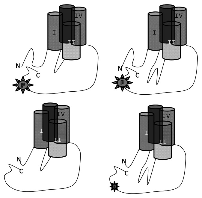 Figure 1. Exon usage influences PKC-mediated C-terminal phosphorylation (note that phosphorylation was not assayed in this study, but was inferred from a Ser to Ala mutation analysis); in turn, C-terminal phosphorylation increases current in long N-terminal splice variants. Four combinations shown: long vs. short N-terminus or LI-II. PKC and Gβγ bind to all N-terminal variants, and oppose PKC effects albeit more efficaciously in short N-terminal variants. Long LI-II partially compensates for short N-terminal.