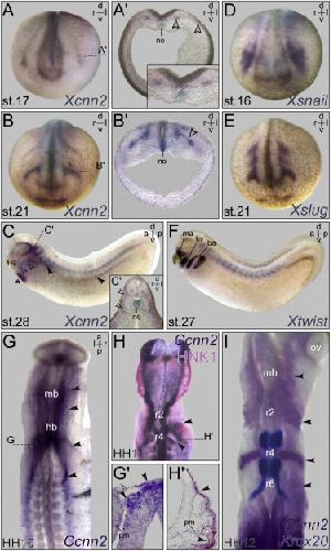 Figure 1. Cnn2 Is Expressed in Migratory NCCs in Frogs and Chicks (A–F) Frog. Cnn2 mRNA localization is shown in delaminating (A) and early migrating NCCs (B and C). Comparison with Xsnail (D), Xslug (E), and Xtwist (F) demonstrates that Cnn2 mRNA was found during early stages of emigration. Transcription was attenuated as cells progressed ventrally (cf. the strength of signals in proximal and distal NCCs in C and F). Note that Cnn2 remained to be expressed in a subpopulation of mandibular, hyoid, and branchial NCCs (open arrowheads). Additional sites of Cnn2 mRNA localization were found in the notochord (A0 –C0 ), heart (asterisk in C), somites, pronephros, and pronephric duct (arrowheads in C). (A0 –C0 ) Histological transverse vibratome sections (levels indicated in A–C). Frontal views in (A), (B), (D), and (E); lateral views (anterior to the left) in (C) and (F). ba, branchial; hy, hyoid; ma, mandibular; no, notochord.