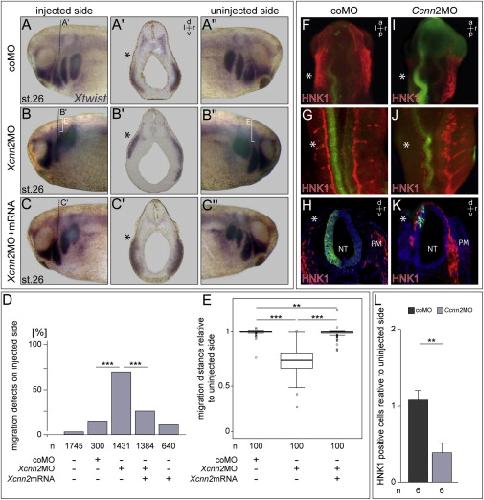 (F–L) Chick. Fluorescent MOs (green) were unilaterally electroporated (asterisks) into the neural tube at the four- to eight-somite stage and analyzed for migratory NCCs by HNK1 staining (red) 16 hr thereafter. Migration of cranial (F) and cervical NCCs (G) was unaffected when coMO was injected, but was inhibited on the injected sides upon Ccnn2MO application (I and J). (H and K) Histological sections at cervical levels of specimens treated with coMO (H) or Ccnn2MO (K).