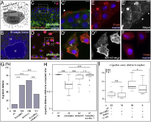 (D) Model of RhoA and Cnn2 acting downstream of PCP to polarize the actin cytoskeleton and direct NCC migration, and a schematic depiction of different migration states in NCC explant. Left: Epithelioid premigratory NCCs are characterized by actin stress fibers. They express RhoA at the plasma membrane (red), leading to Cnn2 phosphorylation and degradation. Middle: Cells at the margin of the epithelioid cell layer, which are about to leave the lattice, are polarized and characterized by central stress fibers and a peripheral cortical actin network. RhoA and Cnn2 (green) are expressed in a mutually exclusive manner such that Cnn2 is found where the cortical actin is localized and RhoA is found in the part of the cells that harbors stress fibers. Right: Migratory mesenchymal NCCs lack stress fibers and possess peripheral actin with colocalized Cnn2 throughout. RhoA is present in migratory mesenchymal cells but absent from the cortical actin network. |