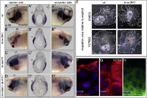(E) Xcnn2MO suppressed Y27632-enhanced NCC migration in explants. Xcnn2 knockdown did not significantly alter NCC migration compared to wild-type explants (top). Rock inhibitor Y27632 induced excess migration, which was suppressed by parallel knockdown of Xcnn2 (bottom).