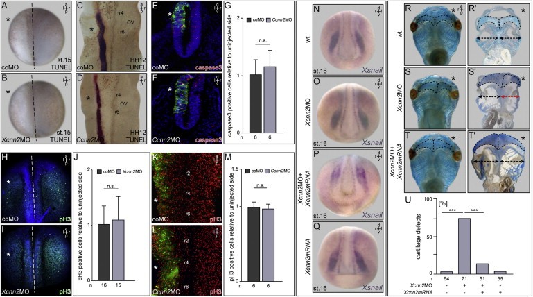 (NâQ) No differences in snail expression in wild-type (N), Xcnn2 knock-down (O) or rescued morphant (P) as well as following Xcnn2 mRNA injection (Q).
