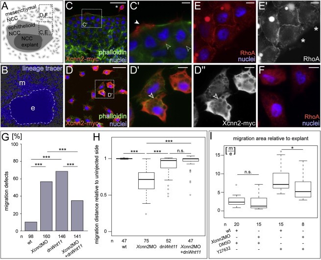 (A–F) Polarized localization of Xcnn2-myc and RhoA in Xenopus NCC explant cultures. (A) Schematic diagram depicting the progression of cell emigration from NCC explants. A multilayered explant is outlined in dark gray, and the epithelioid sheath of monolayered premigratory NCCs and mesenchymal migrating NCCs is indicated in light gray. (B) Low-magnification overview of an explant culture that was injected with lineage tracer to demonstrate that injections targeted cells throughout. e, explant, m, migration area. (C and C0) Xcnn2-myc (red) localization to leading edge of delaminating NCC and throughout a mesenchymal cell (asterisk). Nuclei in blue (DAPI), actin in green (phalloidin staining). (D, D0, and D00) Strong Xcnn2-myc staining in individual mesenchymal cells. Note that Xcnn2- myc was reduced at contact sites (open arrowhead in D0 /D00 ). In (D00 ) Xcnn2-myc (red channel) is shown in white to clearly reveal the attenuation at the contact site. (E and F) Polarized expression of RhoA in the epithelioid part of explant culture (E) was lost in migrating NCCs (F). In (E0) RhoA (red channel) is shown in white to clearly reveal the loss of polarization at the leading edge of delaminating cells (asterisks).