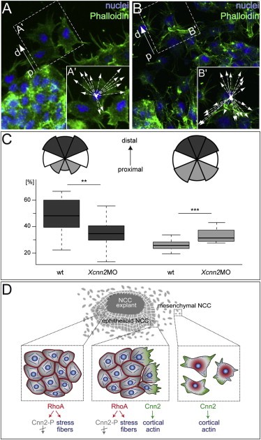 (AâC) Xenopus NCC explants from WT (A) and Xcnn2 morphant (B) embryos were cultured and the actin cytoskeleton was visualized by phalloidin staining. Nuclei were counterstained with DAPI. Panels show cells derived from the epithelioid-mesenchymal transition zone of explants. Magnifications of single WT (Aâ²) and morphant (Bâ²) cells are shown. Broken arrows in (Aâ²) and (Bâ²) indicate cell protrusions. (C) Wind rose diagrams depict the distribution of protrusion angles into eight segments spanning 45° each. Note that in WT explants, cell protrusions (n = 541 from 28 cells derived from six embryos) predominantly point in the distal direction, whereas morphant vectors (n = 521 protrusions, 22 cells, 5 embryos) are randomized. Bottom: Quantification of vector analysis. Morphant cells display significantly fewer distal protrusions (dark gray) and more proximal protrusions (light gray), caused by a loss of cortical actin and a gain of stress fibers.