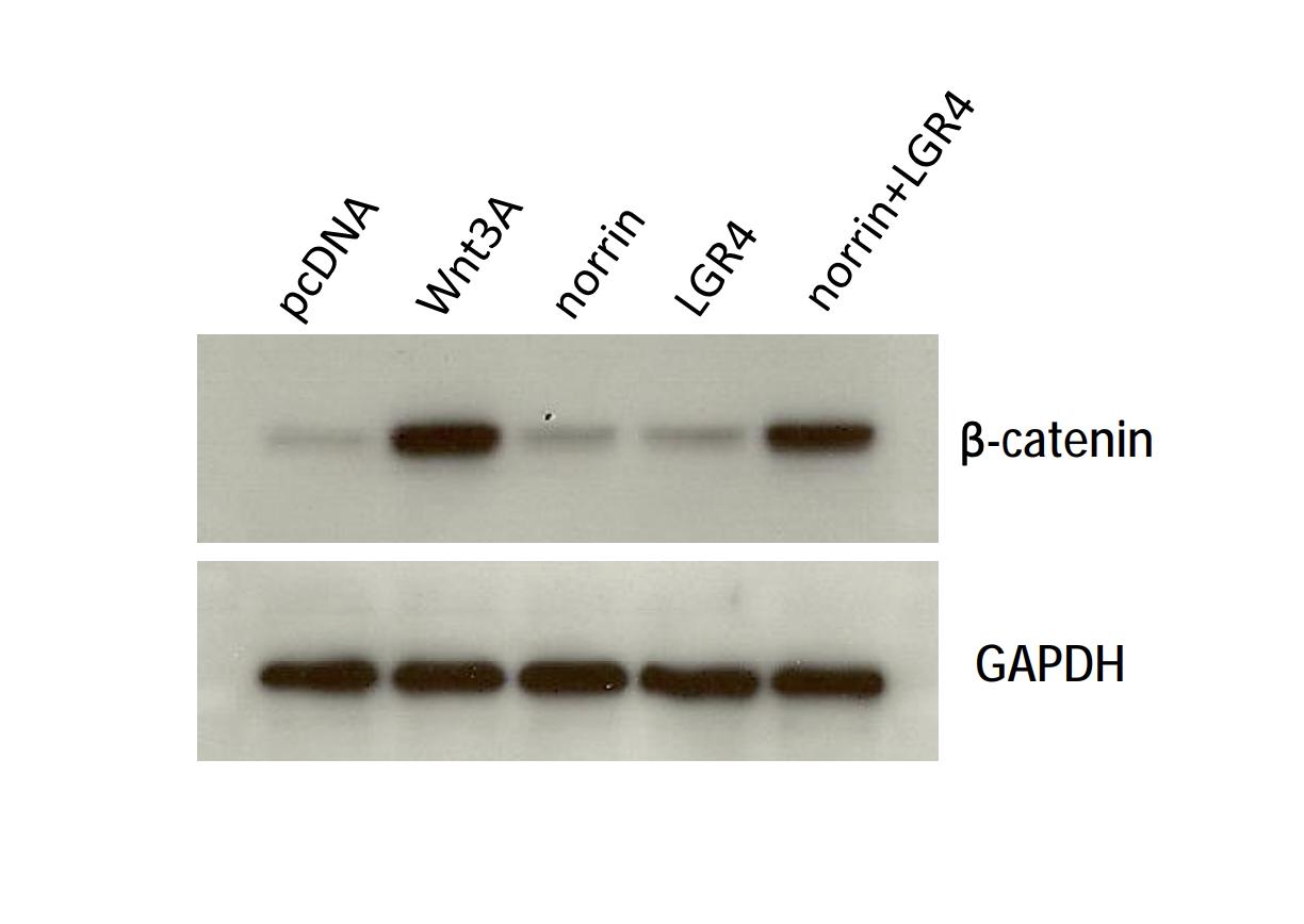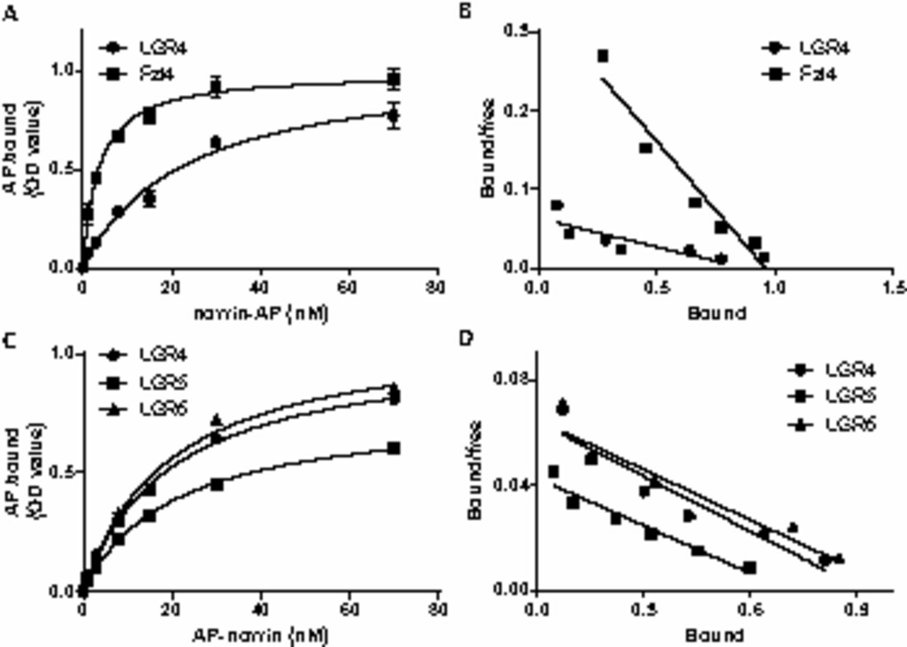 AP-norrin showed positive signals in cells expressing Fzl4, LGR4, LGR5 and LGR6, but not LHR (Luteinizing Hormone Receptor).