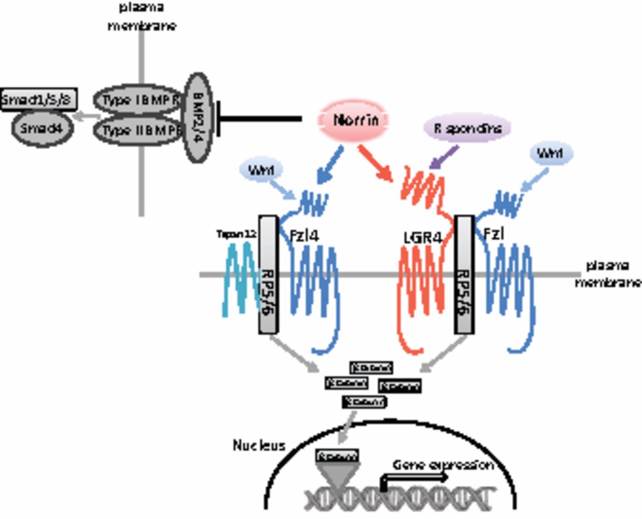 Diagram of norrin as a multifunctional ligand for three receptors/binding proteins. Norrin binds to LGR4, which is also the receptor for R-spondin proteins. LGR4 presumably cooperates with Frizzled (Fzl) receptors activated by Wnt ligands to promote the internalization of LRP5/6, leading to increases in β-catenin levels and the expression of downstream Wnt pathway genes. Norrin also interacts directly with Fzl4 and an auxiliary membrane protein Tspan12 to promote LRP5/6 internalization and to increase β-catenin levels. In addition, norrin binds to BMP2/4 to block the activation of type I and II BMP receptors, leading to decreases in downstream Smad activities. Mutations in humans associated with Norrie disease result in diverse phenotypes probably because of differential activation of Wnt signaling mediated by LGR4 or Fzl4 as well as differential BMP antagonistic activities. |