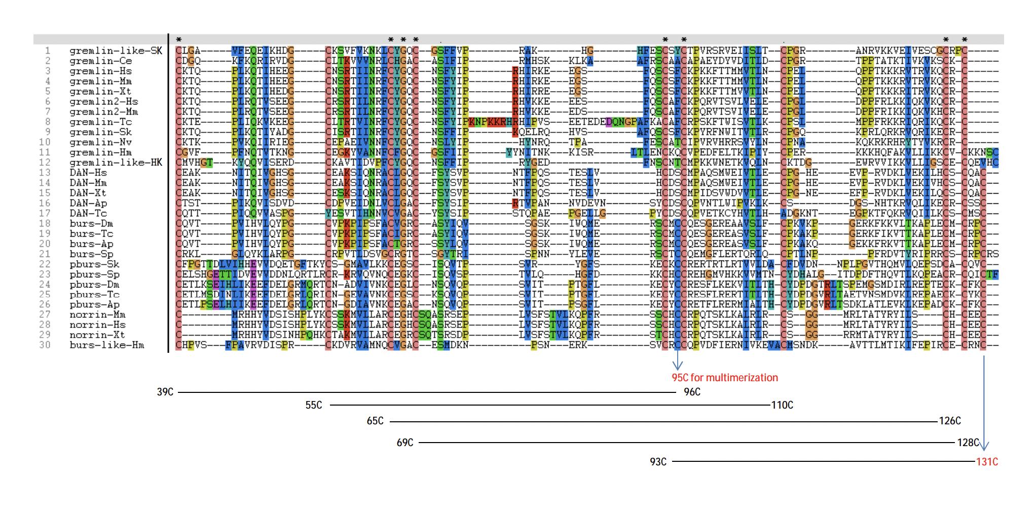 Fig. S1. Alignment of gremlin, DAN and burs/pburs/norrin subfamily. Cystine-knot proteins were categorized into three