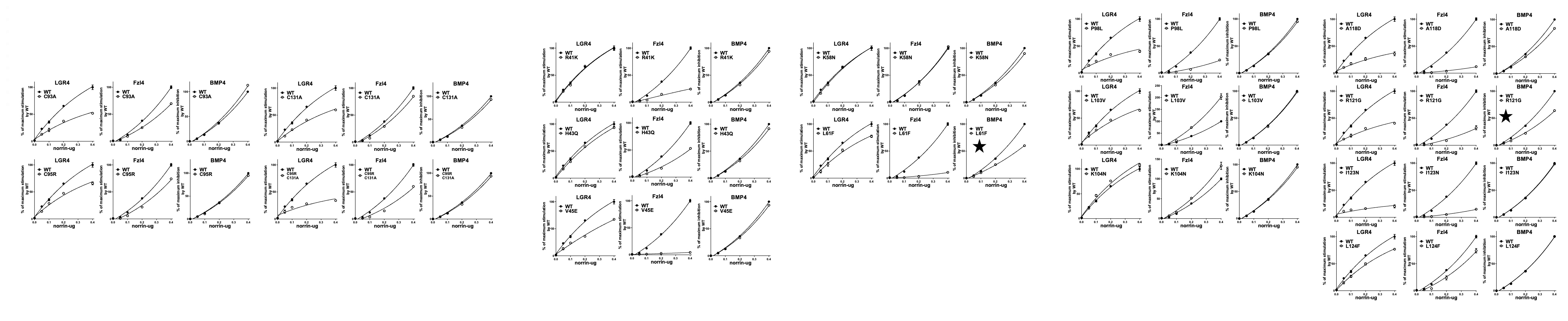 Fig. S10. Ability of selected norrin mutants to regulate three reporter gene assays upon stimulation by LGR4, Fzl4, and BMP4.