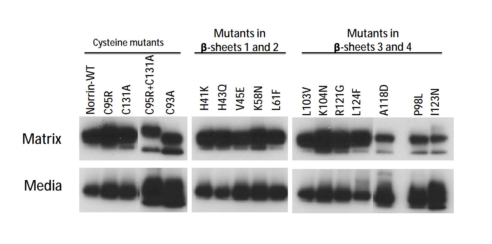 transfected with plasmids encoding norrin and its mutants before immunoblotting analyses of secreted and matrix-bound proteins. |