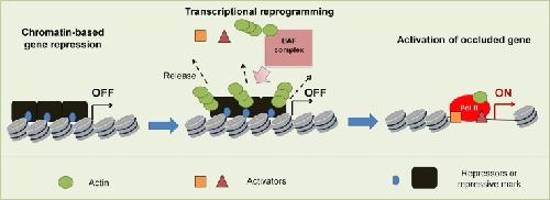 Proper regulation of transcription is essential for cells to acquire and maintain cell identity. Transcriptional activation plays a central role in gene regulation and can be modulated by introducing transcriptional activators such as transcription factors. Activators act on their specific target genes to induce transcription. Reprogramming experiments have revealed that as cells become differentiated, some genes are highly silenced and even introduction of activators that target these silenced genes does not induce transcription. This can be explained by chromatin-based repression that restricts access of transcriptional activators to silenced genes. Transcriptional activation from these genes can be accomplished by opening chromatin, in addition to providing activators. Once a de novo transcription network is established, cells are differentiated or reprogrammed to a new cell type. Emerging evidence suggests that actin in the nucleus (nuclear actin) and nuclear actin-binding proteins are implicated in these transcriptional regulatory processes. This review summarizes roles of nuclear actin and actin-binding proteins in transcriptional regulation. We also discuss possible functions of nuclear actin during reprogramming in the context of transcription and chromatin remodeling.