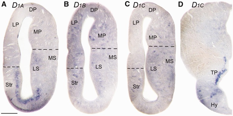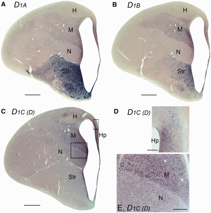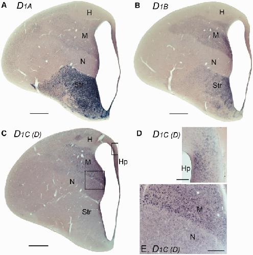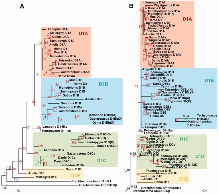 The receptors of the dopamine neurotransmitter belong to two unrelated classes named D1 and D2. For the D1 receptor class, only two subtypes are found in mammals, the D1A and D1B, receptors, whereas additional subtypes, named D1C, D1D, and D1X, have been found in other vertebrate species. Here, we analyzed molecular phylogeny, gene synteny, and gene expression pattern of the D1 receptor subtypes in a large range of vertebrate species, which leads us to propose a new view of the evolution of D1 dopamine receptor genes. First, we show that D1C and D1D receptor sequences are encoded by orthologous genes. Second, the previously identified Cypriniform D1X sequence is a teleost-specific paralog of the D1B sequences found in all groups of jawed vertebrates. Third, zebrafish and several sauropsid species possess an additional D1-like gene, which is likely to form another orthology group of vertebrate ancestral genes, which we propose to name D1E. Ancestral jawed vertebrates are thus likely to have possessed four classes of D1 receptor genes-D1A, D1B(X), D1C(D), and D1E-which arose from large-scale gene duplications. The D1C receptor gene would have been secondarily lost in the mammalian lineage, whereas the D1E receptor gene would have been lost independently in several lineages of modern vertebrates. The D1A receptors are well conserved throughout jawed vertebrates, whereas sauropsid D1C receptors have rapidly diverged, to the point that they were misidentified as D1D. The functional significance of the D1C receptor loss is not known. It is possible that the function may have been substituted with D1A or D1B receptors in mammals, following the disappearance of D1C receptors in these species.