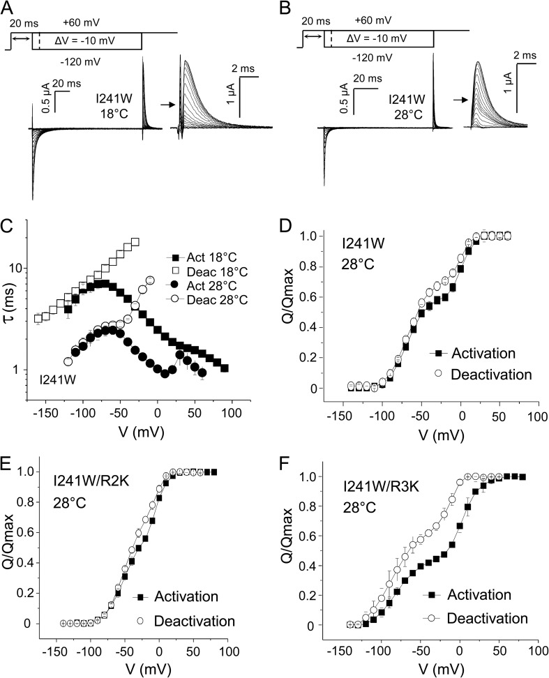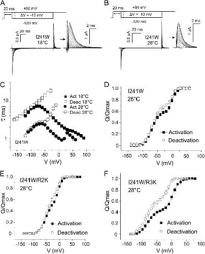 Figure 6. Conservation of the I241W phenotype during deactivation. (A) Deactivation gating current traces recorded in an oocyte expressing I241W channels with the indicated protocol at 18°C. (B) Deactivation gating currents traces recorded in the same cell at 28°C. Traces at the post-pulses in A and B are shown expanded for clarity. (C) τ-V curves of gating currents for the I241W mutant recorded at 18°C (black symbols) or 28°C (open symbols) during activation (circles) or deactivation (squares). (D) Q-V curves for the I241W mutant determined at 28°C during activation (black squares) or deactivation (open circles). (E) Q-V curves for the I241W/R2K mutant determined at 28°C during activation (black squares) or deactivation (open circles). (F) Q-V curves for the I241W/R3K mutant determined at 28°C during activation (black squares) or deactivation (open circles). |
