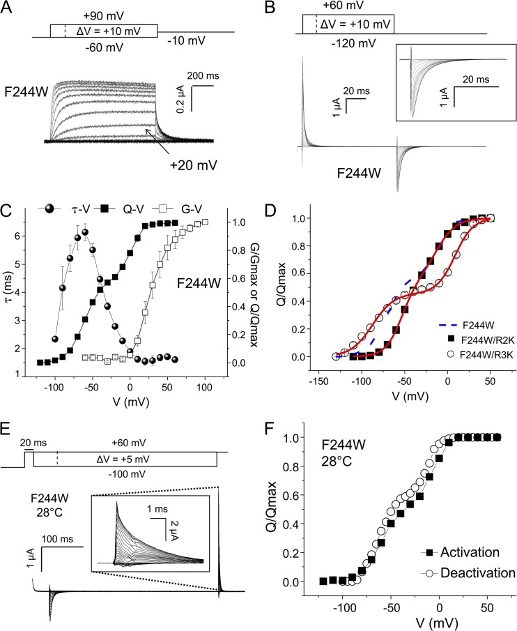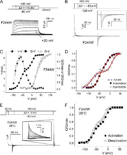 Figure 7. The F244W mutation mimics the I241W mutation. (A) Ionic current traces recorded from the F244W mutant using the indicated activation protocol. (B) Gating current traces recorded from the F244W mutant using the indicated activation protocol. (C) Q-V (black squares), G-V (open squares), and τ-V of gating current (black spheres) plots for the F244W mutant determined from activation protocols. (D) Q-V curves for the double mutants F244W/R2K (black squares) and F244W/R3K (open circles) determined from activation protocols. The dotted blue line represents the Q-V curve of the F244W mutant depicted in C. The red lines represent the fit to a sequential double-Boltzmann equation. (E) Deactivation gating currents measured for the F244W mutant at 28°C. (F) Q-V curves determined at 28°C during activation (black squares) and deactivation (open circles) for the F244W mutant. |
