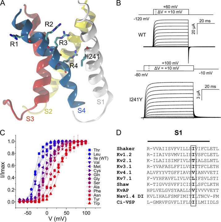 Figure 1. Effect of I241 mutations on Shaker channel gating. (A) Zoomed view of the refined structure of the Kv1.2 voltage sensor (PDB 3LUT; Chen et al., 2010) showing the S1 (white), S2 (yellow), S3 (red), and S4 (blue) helices, the four S4 Arg R1–R4 and the residues I241. (B) Ionic current traces for WT Shaker (top) and I241Y mutant (bottom) recorded using the indicated protocol. (C) G-V curves of Shaker channels as a function of the residue present at position 241. The curves are colored gradually from blue to red relative to their position on the voltage axis from negative to positive potentials. (D) Sequence alignments of the S1 segment (T-Coffee) showing the amino acid at the position homologue to I241 (boxed) in various voltage sensors containing proteins (Shaker, GI: 13432103; Kv1.2, GI: 4826782; Kv2.1, GI: 4826784; Kv3.1, GI: 76825377; Kv4.1, GI: 27436981; Kv7.1, GI: 32479527; Shaw, GI: 220901931; KvAP, GI: 38605092; Nav1.4 domain I, GI: 292495096 and Ci-VSP, GI: 76253898). |
