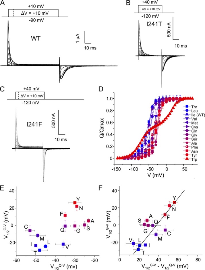 Figure 2. The I241 mutations alter VSD movement. The figure shows the gating currents traces for WT Shaker (A), the I241T (B), and I241F (C) mutants recorded using the indicated protocols. (D) Q-V curves for the WT and I241 mutants. (E and F) Correlation plots between the mid-points of the G-V (V1/2G-V) and Q-V (V1/2Q-V) (E) and between V1/2G-V and the difference V1/2G-V – V1/2Q-V (F). The line represents a linear fit to the data (R2 = 0.97). The coloring method in D–F is identical to Fig. 1 C. |