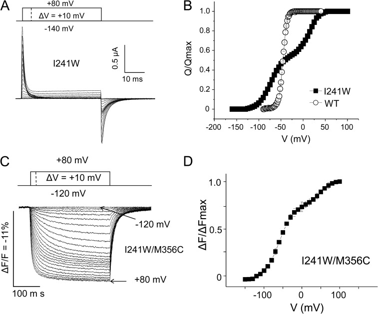 Figure 3. I241W transiently immobilizes S4. (A) Family of gating currents recording for the I241W mutant. (B) Q-V plots for the WT and I241W channels. (C) Family of fluorescence recordings of a tetramethylrhodamine-maleimide fluorophore attached to M356C in the I241W mutant. (D) F-V curve of the labeled I241W/M356C mutant obtained from an isochronal plot of the fluorescence intensities at the end of 300-ms test pulses. |