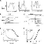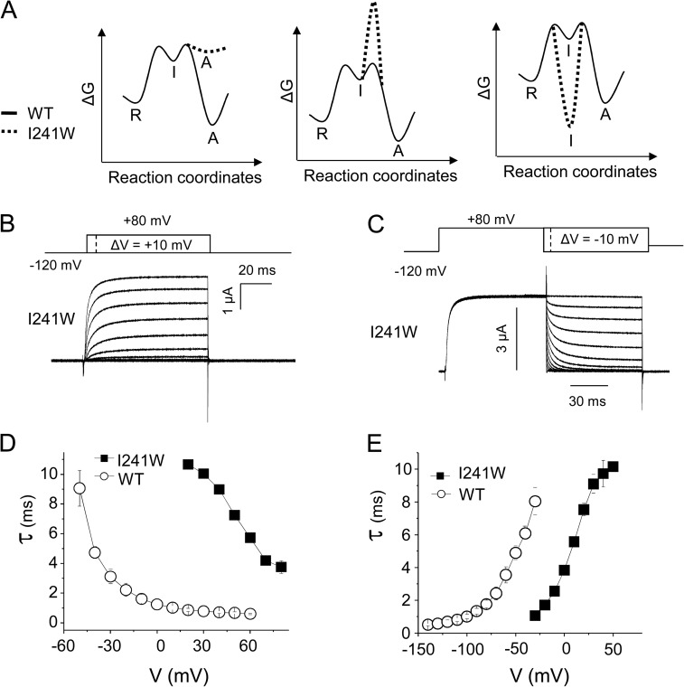 Figure 4. Hypothetical mechanisms for the I241W phenotype. (A) Hypothetical energy diagram of the VSD transitions showing the resting (R), intermediate (I), and active (A) states at a voltage of 0 mV. The dotted lines indicate possible effects of the I241W mutation: destabilization of the active state (left), increase of the energy barrier between the intermediate and active states (middle), and stabilization of the intermediate state (right). (B) Activation ionic currents recordings for I241W channels. (C) Deactivation ionic currents recordings for I241W channels. (D) τ–V plots for WT and I241W channels during activation. (E) τ–V plots for WT and I241W channels during activation. |