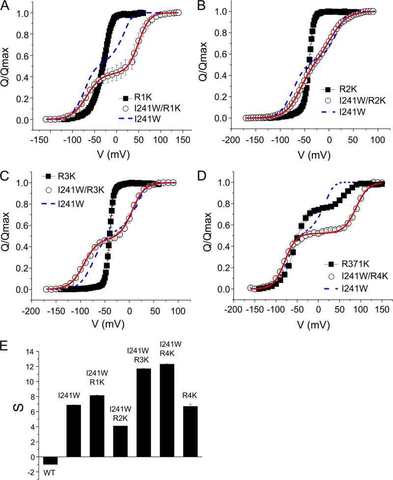 Figure 5. The I241W phenotype depends on the S4 Arg. The figure shows the Q-V curves measured during an activation pulse protocol for the mutants R1K (A, black squares), R2K (B, black squares), R3K (C, black squares), R4K (D, black squares), and the double mutants I241W/R1K (A, open circles), I241W/R2K (B, open circles), I241W/R3K (C, open circles), and I241W/R4K (D, open circles). In each graph, the dotted blue line represents the Q-V curve for the I241W mutant and the red line represents the fit to a sequential double-Boltzmann equation. (E) Histogram showing the s values (s = e0(V2z2 −V1z1)/kT) (see Table 1). A positive value indicates the presence of a stabilized intermediate state. |