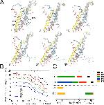Figure 9. Simulation of the VSD trajectory using the string method. (A) The figure shows selected snapshots of VSD conformations along the converged path from the string method. The numbers indicate the positions from the initial linear path between the up (image #1) and down (image #32) states. The coloring method for S1–S4 is the same as in Fig. 1 A. The side chains of F233 (F290 in Shaker), I177 (I241 in Shaker) E0-2, D3, and R1–R4 are shown in all snapshots in licorice representation. (B) Vertical Z-distance of the S4 arginines relative to the center-of-mass of F233 side chain along the optimized path. The solid and dashed lines correspond to the distance relative to the R1–4 Cζ and R1–4 Cα, respectively. (C) Transient salt bridges analysis along the optimized path; according to the color code, a color corresponding to a particular arginine/lysine is drawn at an image if in the corresponding configuration there is a salt bridge between the basic and the acidic residue. The index of the images along the path is reported on the x-axis, and the acidic amino acids making interactions with the S4 arginines are reported on the y-axis. The horizontal dashed line schematically separates the extracellular region (above) from the intracellular (below). |