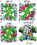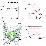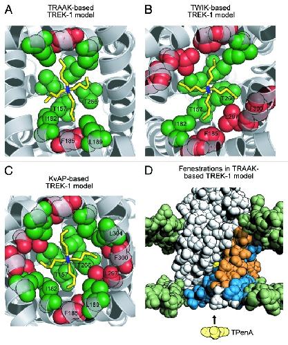 Figure 1. Refined structural models of TREK-1 with TPenA bound. (A) Bottom up view of a structural model of the TREK-1 pore with docked TPenA. The model was based upon the crystal structure of TRAAK (PDB ID: 3UM7). Those residues which interact with TPenA are highlighted as spheres and colored green if they agree with our functional scanning mutagenesis study or red if a false positive. Only residues on one protomer are numbered. (B) Similar model based upon the crystal structure of TWIK-1 (PDB ID: 3UKM). (C) Similar model based upon the crystal structure of KvAP (PDB ID: 1ORQ). (D) Solvent-accessible surface area (SASA) of a TREK-1 model, based on TRAAK, in which the side-fenestrations are still clearly visible. The SASA of the phospholipid head groups is colored green whereas the TREK-1 model is colored gray. For one protomer, the outer (M1 and M3) and inner (M2 and M4) transmembrane helices are highlighted in orange and blue, respectively. The docked TPenA is also visible through the side-fenestration (colored in yellow spheres) and QA ion access to this binding site occurs via the cytoplasmic pore of the channel (indicated by direction of the arrow).