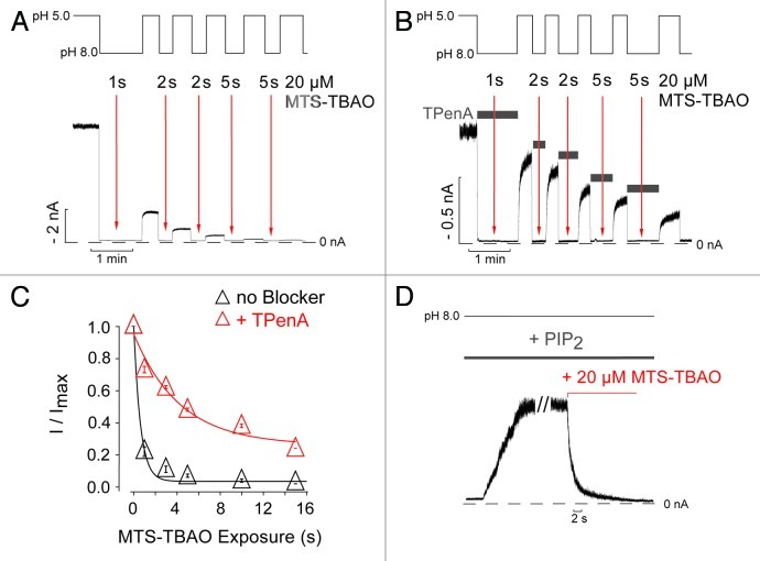 Figure 3. State-independent access of MTS-TBAO to the inner pore of TREK-1. (A) TREK-1 currents activated by pH 5 were exposed to repeated applications of 20 µM MTS-TBAO at pH 8 for the times indicated by the arrows in order to test the accessibility of Cys-186 in the closed state. (B) A similar experiment performed in the presence of 1 mM TPenA, which blocks TREK-1 with an IC50 of 13 ± 1 µM.8 The channels were exposed to the blocker during the time indicated by the horizontal bars that resulted in complete inhibition of the current. Twenty µM MTS-TBAO was then applied to the blocked channel at times indicated by the arrows. (C) Time course of the relative current decline from experiments such as those shown in panelsA and B as a function of cumulative reagent exposure (Modification Time x [MTS-TBAO]) resulted in a monoexponential time course of 0.7 ± 0.1 sec (n = 6) in absence and 8.2 ± 0.9 sec (n = 3) in the presence of 1 mM TPenA. Data points represent mean ± SEM. (D) Activation of TREK-1-G186C mutant channels by 10 µM PtdIns(4,5)P2 at pH 8 and subsequent application of MTS-TBAO irreversibly reduced the current. The decay of the current was fitted to a monoexponential function with a Tau (τ) of 1.2 ± 0.1 sec (n = 3).