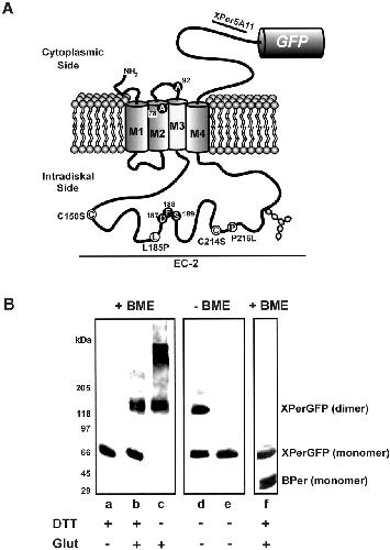 Figure 1. Analysis of Xenopus peripherin-2-GFP fusion protein. (A) Topological model for Xenopus peripherin-2 showing the location of the GFP fusion protein, the epitope for the Xper5A11 mAb, mutations analyzed in this study (white circles), and amino acids that differ from the published sequence (black circles). (B) Western blots of Xenopus peripherin-2-GFP expressed in COS-1 cells. COS-1 membranes were preincubated with or without DTT, solubilized in Triton X-100, treated with or without glutaraldehyde (Glut), and fractionated on SDS gels under reducing (+BME, β-mercaptoethanol) or nonreducing (-BME) conditions. Lanes aâd: WT Xenopus peripherin-2-GFP labeled with an anti-GFP antibody. Lane e: C150S Xenopus peripherin-2-GFP labeled with anti-GFP antibody. Lane f: Coexpression and coimmunoprecipitation of Xenopus peripherin-2-GFP (XPerGFP) and bovine peripherin-2 (BPer) with bovine specific Per2B6-Sepharose. Western blots were labeled with an anti-GFP antibody to detect XperGFP and the Per2B6 antibody to detect BPer. |