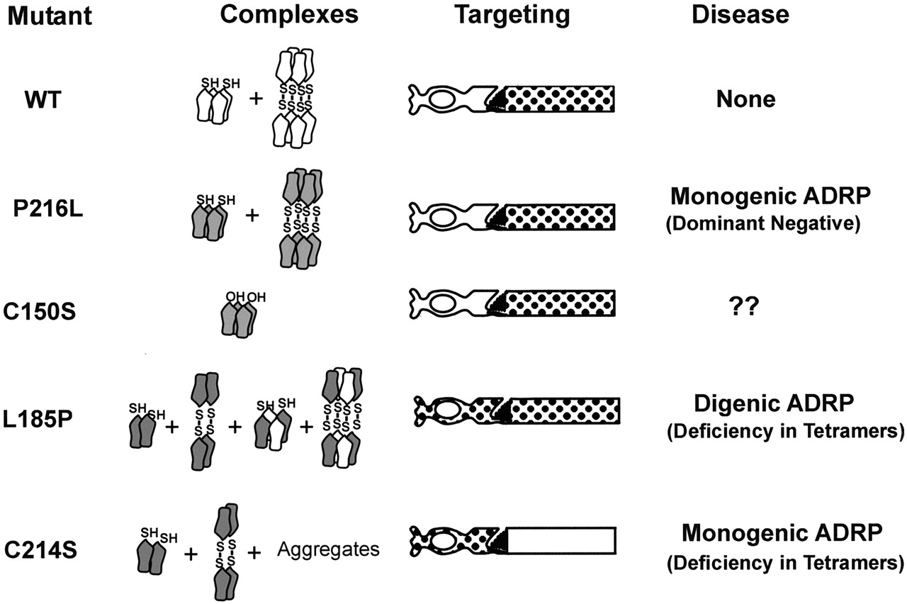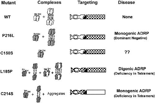 Figure 8. Schematic summarizing the relationship between peripherin-2 subunit assembly, targeting and ADRP. WT (white) and the P216L (shaded) peripherin-2, which form a mixture of core tetramers and disulfide-linked oligomers in association with endogenous X. laevis peripherin-2, target normally to ROS disks (patterned region). The P216L mutant causes ADRP through a dominant negative mechanism. The C150S mutant, which forms core tetramers but not disulfide-linked oligomers, also targets to ROS disks. The L185P mutant forms homodimers and disulfide-linked tetramers, which are retained in the inner segment, and noncovalent tetramers and oligomers with WT peripherin-2, which target to ROS. The C214S mutant forms homodimers, disulfide-linked tetramers and aggregates. These complexes are retained in the cell body, inner segments and cilium. The C214S and L185P mutants cause ADRP through a deficiency in functional core tetramers. |