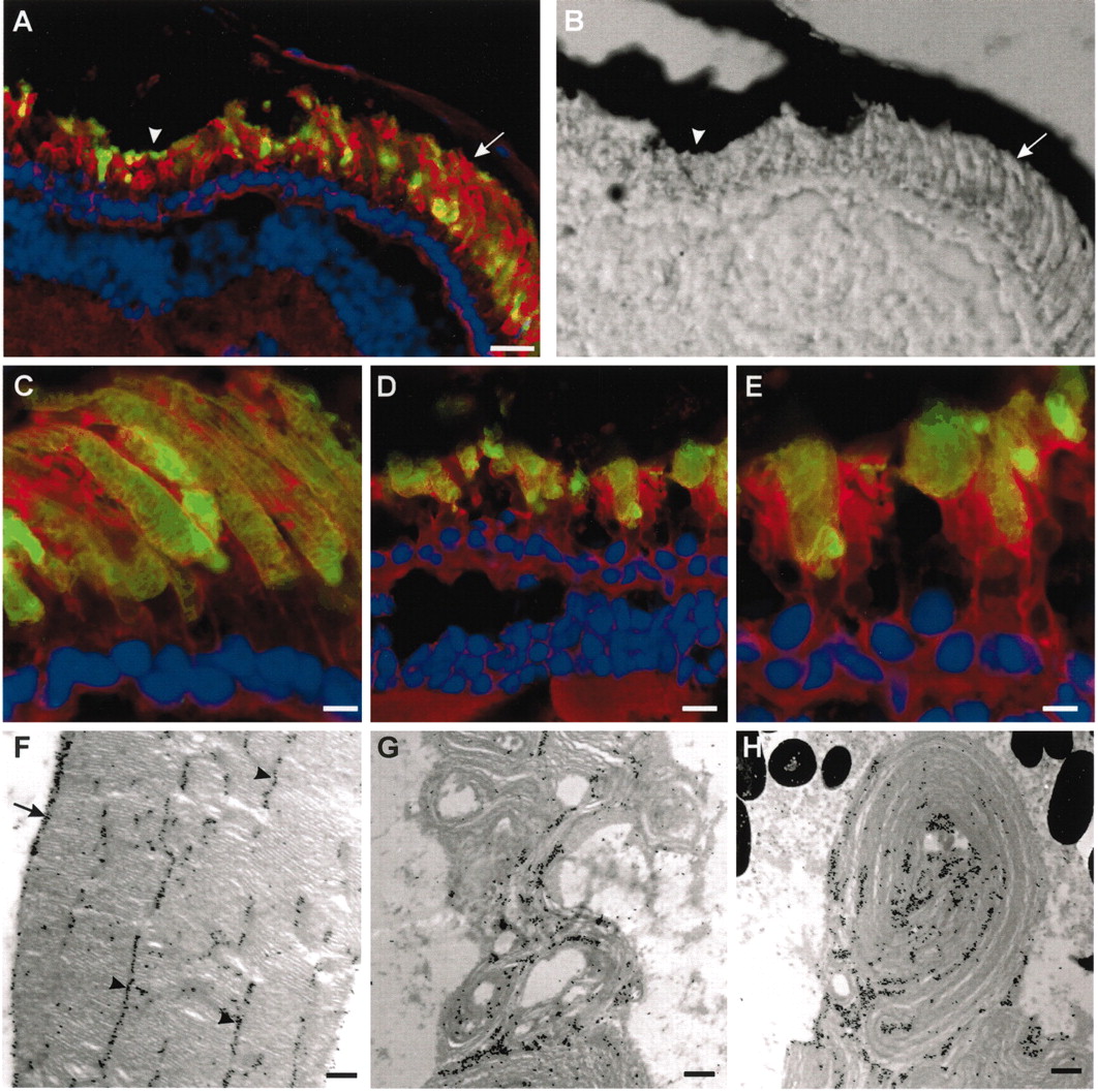 Figure 4. P216L peripherin-2 targets to the ROS and induces degeneration. (A) Fluorescence and (B) corresponding DIC image of a retina expressing Xenopus P216L-peripherin-2-GFP (green) and labeled with TR-WGA (red) and Hoescht 33342 (blue). Rods in the peripheral retina (arrow) appear normal while rods in the central retina (arrowhead) have short, highly disorganized outer segments. All detectable P216L fusion protein targets to ROS. Confocal micrographs of peripheral (C) and central (D and E) regions of the same retina show specific targeting of the fusion protein to ROS and degeneration of the central rods. (FâH) Electron micrographs of ROS labeled with an anti-GFP antibody and immunogold particles. (F) ROS from peripheral retina show normal ultrastructure with the P216L mutant protein localized to the disk rims (arrows) and incisures (arrowheads). (G and H) ROS from the central retina appear highly disorganized with whorls of disk membranes with an irregular distribution of fusion protein. ros, rod outer segment; ris, rod inner segment; n, nucleus. Bars: (A and B) 20 μm; (C) 5 μm; (D) 10 μm; (E) 5 μm; (FâH) 0.25 μm. |