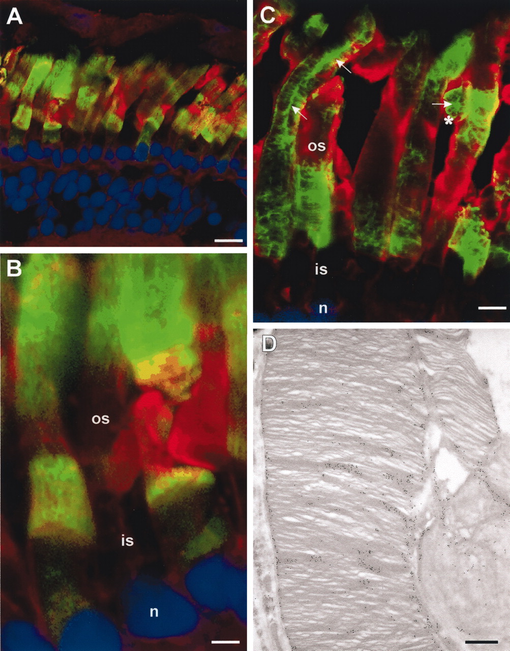 Figure 5. Distribution of L185P and C150S peripherin-2-GFP in rod photoreceptors. (A and B) Retina expressing Xenopus L185P peripherin-2-GFP (green) and labeled with TR-WGA (red) and Hoescht 33342 (blue). The L185P mutant is present in ROS in all cells; however, in >25% of the cells the L185P mutant is also present in the inner segment and cell body. (C) Retina expressing Xenopus C150S peripherin-2-GFP in ROS. The fusion protein is exclusively localized to the ROS. The vertical striations characteristic of disk incisure localization are not evident; instead a more mottled labeling of the outer segments is observed with some outer segments showing a single vertical column of labeling (arrows; asterisk marks a ROS in cross section). (D) Electron micrograph showing immunogold labeling of the C150S peripherin-2-GFP. Some missorting to the lamellar region of the disks is apparent. ros, rod outer segment; ris, rod inner segment; n, nucleus. Bars: (A and B) 5 μm; (C) 10 μm; (D) 2.5 μm. |