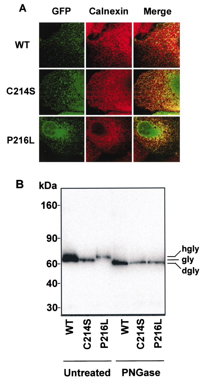 Figure 6. Expression and biochemical properties of Xenopus peripherin-2-GFP in cultured COS cells. (A) Confocal micrographs of COS cells expressing WT, C214S, or P216L Xenopus peripherin-2-GFP (XPer-GFP) and labeled with an anticalnexin antibody as an ER marker. WT peripherin-2 and a portion of the mutants are present in intracellular vesicles that do not label for calnexin. A significant fraction of the C214S mutant as well as L216P, however, is retained in the ER. (B) Membranes from cells transfected with wild-type (WT), C214S or P216L peripherin-2-GFP were solubilized and incubated in the presence or absence of PNGase. Peripherin-2 was resolved by SDS gel electrophoresis and detected on Western blots labeled with an anti-GFP antibody. A small shift in glycosylated (gly) WT and C214S peripherin-2 and hyperglycosylated (hgly) P216L peripherin-2 to its deglycosylated (dgly) form is observed after treatment with PNGase. |