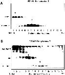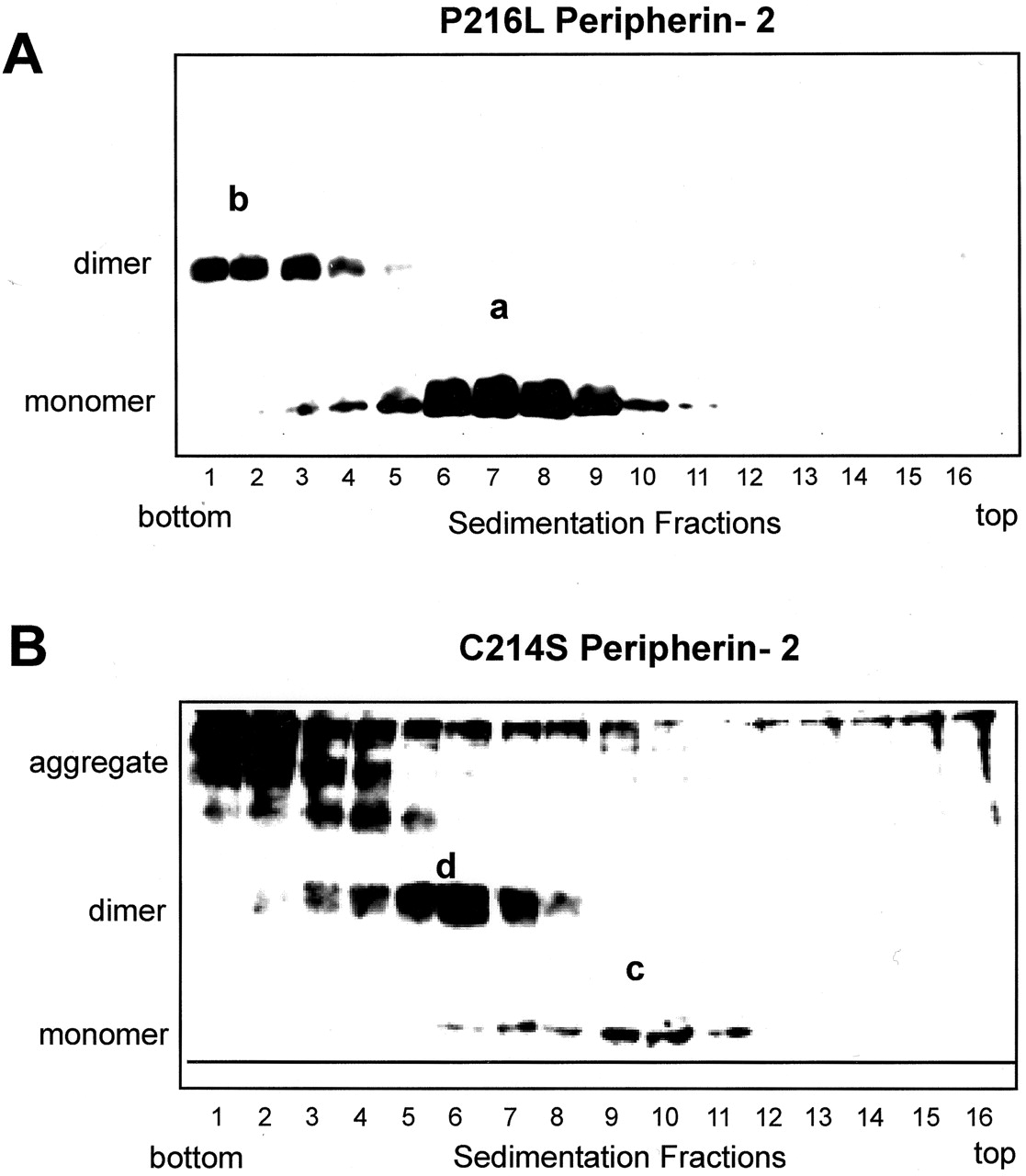 Figure 7. Velocity sedimentation of P216L and C214S peripherin-2 mutants under nonreducing conditions. COS-1 cells expressing bovine P216L (A) and C214S mutant (B) were solubilized in Triton X-100 and subjected to velocity sedimentation. Western blots of the fractions run on nonreducing SDS gels were labeled with the Per2B6 peripherin-2 antibody. The P216L peripherin-2 exhibits a profile consisting of noncovalent tetramers (a) and higher order disulfide-linked oligomers (b) similar to that observed for WT peripherin-2 (Loewen and Molday, 2000). The C214S peripherin-2 produces a mixture of noncovalent dimers (c), tetramers composed of disulfide-linked dimers (d), and aggregated species that sediment near the bottom of the tube. |