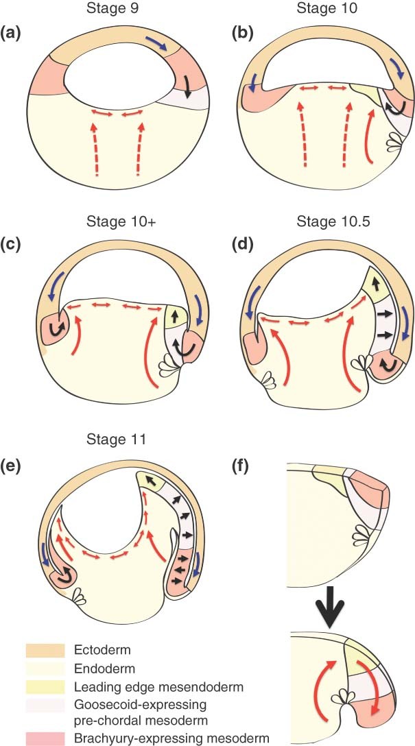 The movement of the prospective mesoderm and endoderm to the interior of the amphibian embryo starts in the vegetal cell mass well before the onset of overt gastrulation. By an animally directed movement of cells, the vegetal mass constricts its outer part and expands its inner region including the blastocoel floor, in a process of pregastrulation emboly. Further internalization of the vegetal region has been studied in the Xenopus embryo. At the onset of gastrulation, vegetal rotation sets in at the periphery of the vegetal cell mass, first dorsally and then spreading laterally and ventrally. It consists of an intense inward surging of cells due to active cell rearrangements that can be observed in explants of the vegetal cell mass. In its course, the blastocoel floor expands further and becomes apposed to the blastocoel roof. The boundary between apposed floor and roof forms Brachet's cleft. Another effect of vegetal rotation is the downward and inward movement of the mesodermal marginal zone, constituting the first phase of involution. Together, the upward and outward movement of the peripheral vegetal mass and the downward and inward translocation of the marginal zone lead to an apparent rotation of the whole peripheral region of the gastrula. Vegetal rotation continues to contribute to endoderm internalization to near the end of gastrulation.