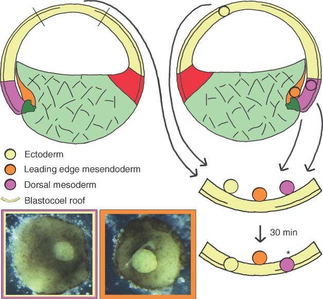 Figure 2. Blastocoel roof assay (BCR). Schematic drawing of the BCR assay that tests for mesendodermal separation behavior and ectodermal repulsion behavior. Cell aggregates (circles) are placed on blastocoel roof. Separation behavior is scored after 30 min. Ectodermal (yellow circle) and dorsal mesodermal (purple circle) cell aggregates integrate when placed on the blastocoel roof. *Note that the dorsal mesoderm develops separation behavior only during involution and then separates, indicating that tissue separation is temporally controlled. The leading edge mesendoderm (orange circle) already achieves separation behavior and stays on top of the blastocoel roof. Photographic images: ectodermal and dorsal mesodermal aggregates (purple and yellow border) appear reintegrated into the blastocoel roof and leading edge mesendodermal aggregates (orange border) form a bulk on the surface of the blastocoel roof, indicating tissue separation. Photographic images were provided by M. Jungwirth. (Reprinted with permission from Ref 7. Copyright 2004 Cold Spring Harbor)