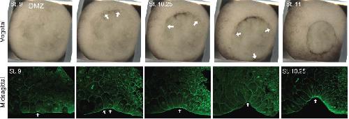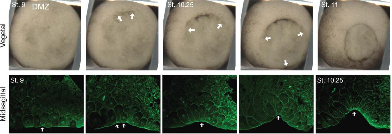 Bottle cell formation as the first external sign of Xenopus gastrulation. Top, vegetal view of blastopore formation, with bottle cells forming initially in the dorsal marginal zone (DMZ), then laterally and ventrally to form the circular blastopore. Arrows mark the extent of apically constricting bottle cells. Bottom, midsagittal confocal images of bottle cells immunostained with α-tubulin antibody. Embryos are oriented apical down and animal to the right. Arrows point to center of blastopore invagination. St., stage. (Reprinted with permission from Ref 3. Copyright 2007 Elsevier)