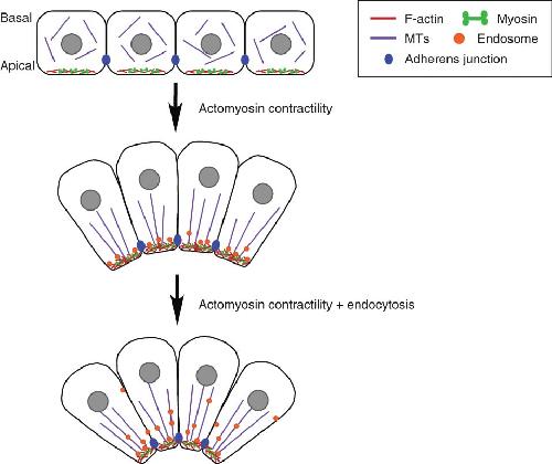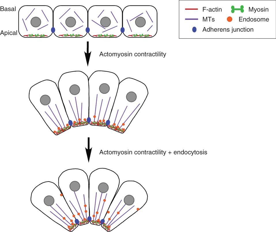 Schematic of the cytoskeletal mechanisms underlying bottle cell apical constriction, as described in Refs 3 and 24. Actomyosin contractility is the main driving force, but endocytosis is also required for efficient constriction later in the process. Adherens junctions have not been directly implicated but are drawn in at their presumed subcellular location.