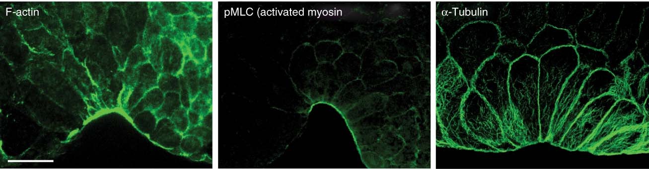 F-actin and activated Myosin (pMLC) are enriched apically in bottle cells, whereas microtubules (α-tubulin) are arranged in apicobasal arrays. Midsagittal confocal images; embryos are oriented apical down and animal to the right. Scale bar = 50 µm. (Reprinted with permisson from Ref 3. Copyright 2007 Elsevier)