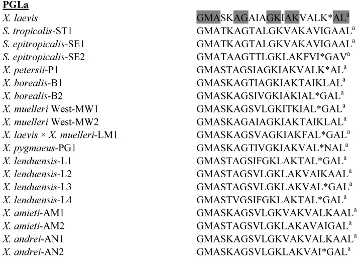 Gibson, Novel peptide fragments originating from PGLa and the caerulein and xenopsin precursors from Xenopus laevis. 1986, Pubmed , Xenbase