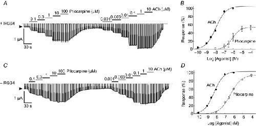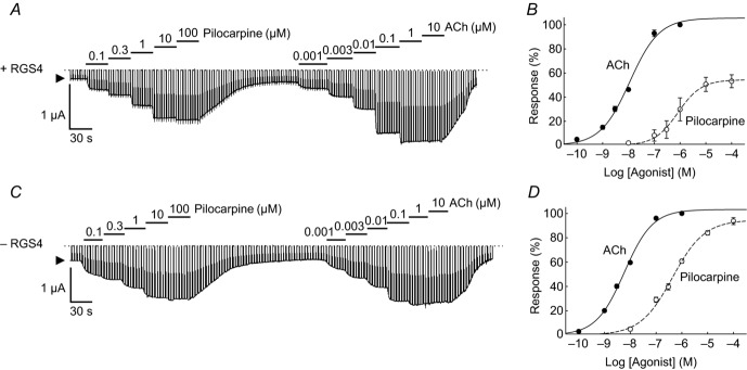 Figure 2. Concentration–response curve of pilocarpine and AChCurrents were recorded in the presence of pilocarpine (0.1–100 μm) and ACh (0.001–10 μm) with a holding potential of −60 mV in oocytes with (A) and without (C) expression of RGS4. The bars above each trace indicate the periods and concentrations of application of ACh or pilocarpine. Dashed lines indicate the zero current level and arrowheads indicate the basal current level. Concentration–response curves of pilocarpine and ACh in oocytes with (B) or without (D) expression of RGS4. The average maximal response of ACh-evoked KG currents was set as 100%. The vertical axis indicates the relative percentages of response that were induced by each concentration of agonists. Data show the means ± SEM, n = 6 at each concentration in both with and without RGS4 groups. All symbols have attached error bars, but some of them are smaller than the symbol.