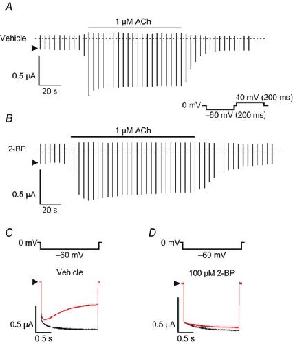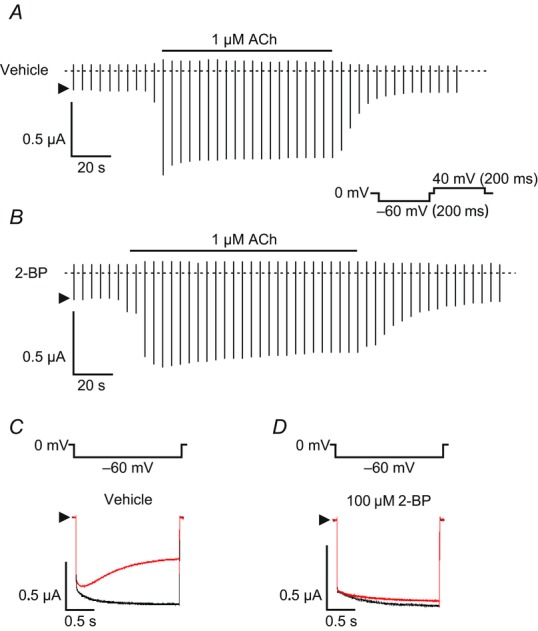 Figure 5. Effects of a palmitoylation inhibitor 2–BP on agonist-evoked KG currentsACh (1 μm)-evoked KG currents were recorded in RGS4-expressing oocytes in vehicle (contained ≤0.1% ethanol) (A) or pretreatment with 2–BP (100 μm) for ≥2 h (B) with a continuous test pulse as showed on the right side of current traces. The interval of each pulse is 3 s. Relative KG currents of pilocarpine (100 μm) to ACh (1 μm) were recorded in the same oocyte at −60 mV in the presence of vehicle (C) or 2–BP (D). Basal currents were subtracted.