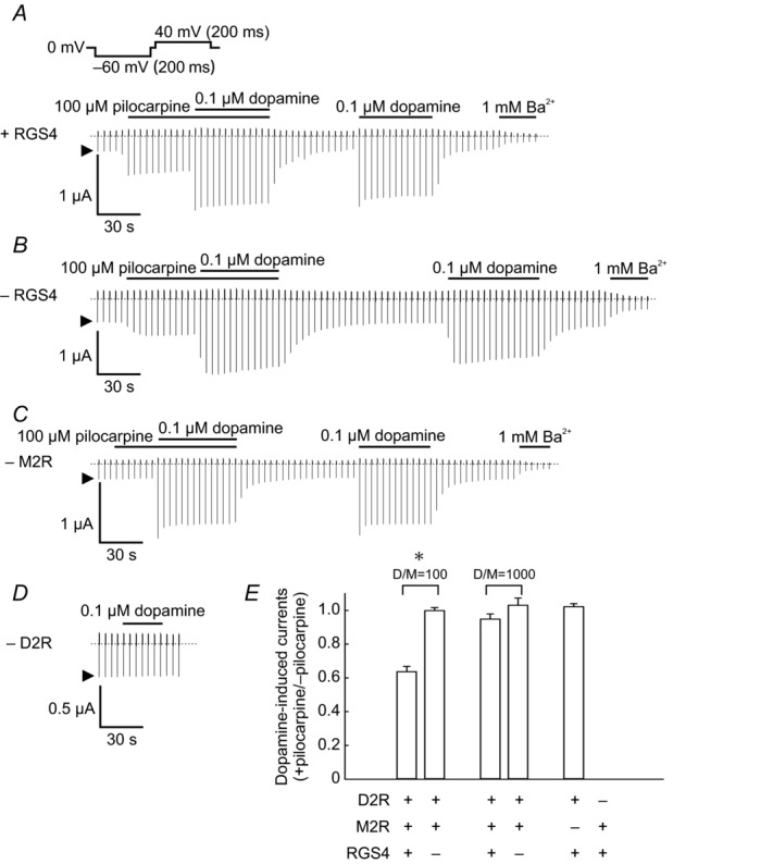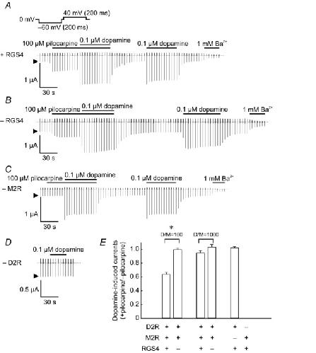 Figure 6. Suppression of dopamine-evoked KG currents by pilocarpine via RGS4 and M2RAgonist-evoked KG currents were recorded in oocytes expressing D2R and M2R (injected cRNA ratio of D2R to M2R = 100, D/M = 100) with (A) or without (B) RGS4 by a continuous test pulse as shown above the current traces. The bars above each trace indicate the application of dopamine, pilocarpine and K+ channel blocker Ba2+. C, the current recorded in an oocyte that did not express M2R. D, the current recorded in an oocyte that did not express D2R. E, the ratio of dopamine-evoked currents in the presence of pilocarpine (100 μm) to dopamine-evoked currents in the absence of pilcarpine at −60 mV. Basal and pilocarpine-evoked currents were subtracted. D/M = 100 indicates the high M2R-expressing group and D/M = 1000 indicates the low M2R-expressing group (injected cRNA ratio of D2R to M2R = 1000). Data show the mean ± SEM, n = 6. * indicates a significant difference (P < 0.05).