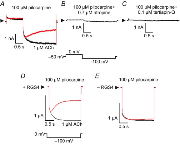 Figure 1. Effects of RSG4 on ACh- and pilocarpine-evoked KG currentsA, 100 μm pilocarpine-evoked KG currents (red) relative to 1 μm ACh-evoked KG currents (black) in the same rat atrial myocyte. Whole-cell currents were recorded with a voltage pulse protocol as showed below the current traces and basal currents were subtracted. Arrowheads indicate the zero current level. Pilocarpine (100 μm)-evoked currents were blocked in the presence of 0.7 μm atropine (B) or 0.1 μm tertiapin-Q (C) in atrial myocytes. Agonist-evoked currents were recorded in the same oocyte expressing M2Rs and the Kir3.1/Kir3.4 heteromultimer with (D) and without (E) RGS4 at −100 mV.