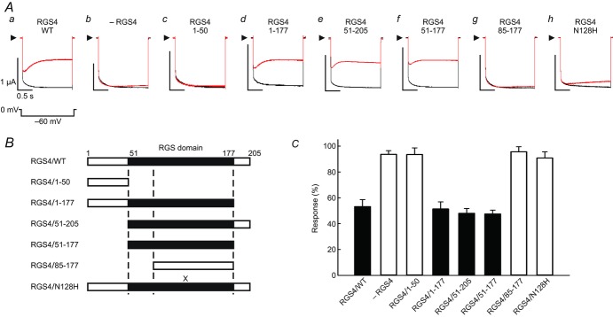 Figure 4. Requirements of RGS4 domain for partial agonism of the M2R-activated KG currentsA, ACh (1 μm)-evoked KG currents (black) and pilocarpine (100 μm)-evoked KG currents (red) in oocytes expressing wild-type RGS4 (a), without RGS4 expression (b) and expressing various RGS4 mutants (c–h) at –60 mV. B, formations of truncated mutants of RGS4 and a point mutation in RGS domain. Black portions represent the region of RGS domain. C, the response of pilocarpine-evoked KG currents relative to ACh-evoked KG currents was calculated from steady state at −60 mV. The bar graph shows the means ± SEM, n = 6–9. The filled bars indicate that the intact RGS domain is included in the mutants; the open bars indicate absence of the intact RGS domain and a significant difference (P < 0.05) from the wild-type RGS4 group.