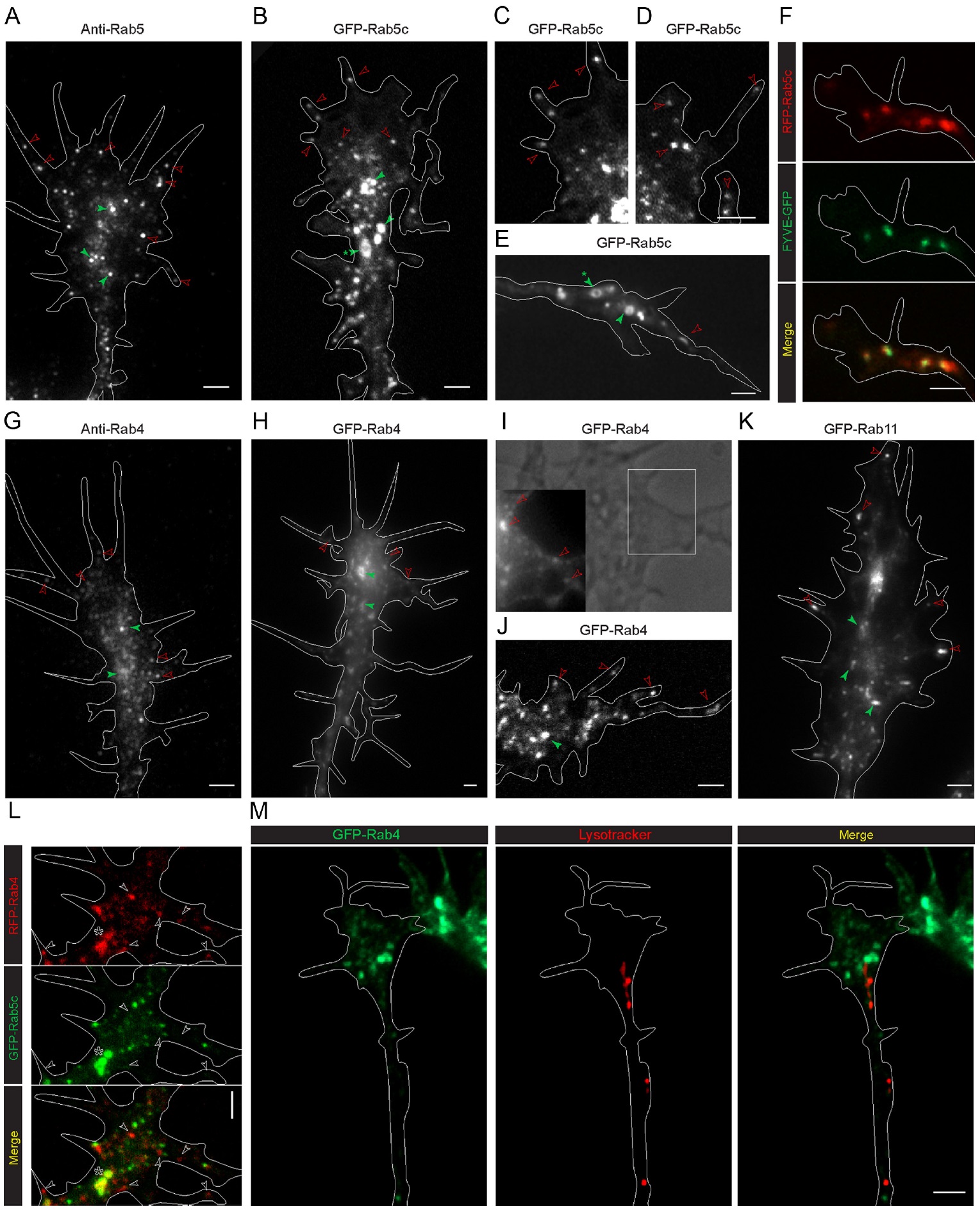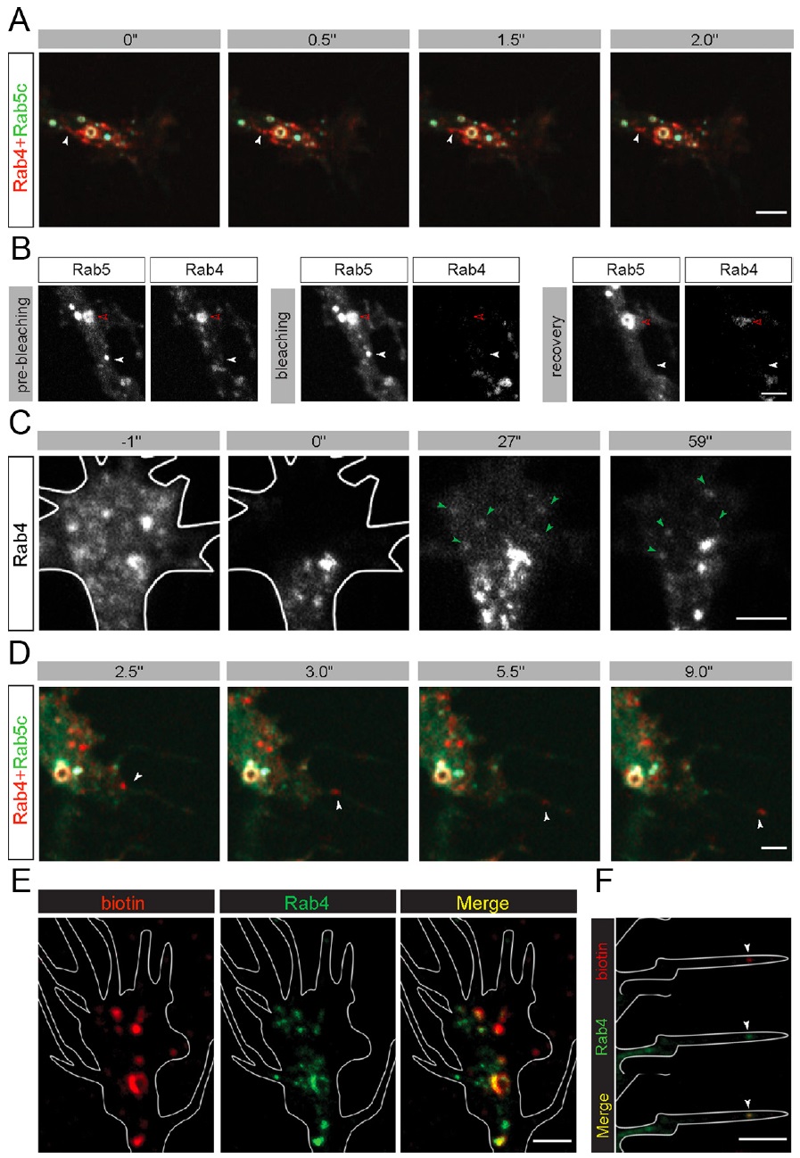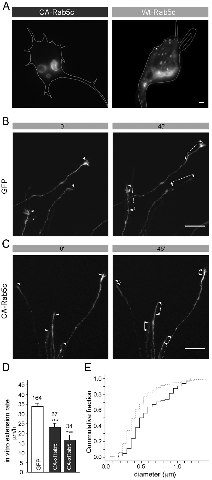 The elongation rate of axons is tightly regulated during development. Recycling of the plasma membrane is known to regulate axon extension; however, the specific molecules involved in recycling within the growth cone have not been fully characterized. Here, we investigated whether the small GTPases Rab4 and Rab5 involved in short-loop recycling regulate the extension of Xenopus retinal axons. We report that, in growth cones, Rab5 and Rab4 proteins localize to endosomes, which accumulate markers that are constitutively recycled. Fluorescence recovery after photo-bleaching experiments showed that Rab5 and Rab4 are recruited to endosomes in the growth cone, suggesting that they control recycling locally. Dynamic image analysis revealed that Rab4-positive carriers can bud off from Rab5 endosomes and move to the periphery of the growth cone, suggesting that both Rab5 and Rab4 contribute to recycling within the growth cone. Inhibition of Rab4 function with dominant-negative Rab4 or Rab4 morpholino and constitutive activation of Rab5 decreases the elongation of retinal axons in vitro and in vivo, but, unexpectedly, does not disrupt axon pathfinding. Thus, Rab5- and Rab4-mediated control of endosome trafficking appears to be crucial for axon growth. Collectively, our results suggest that recycling from Rab5-positive endosomes via Rab4 occurs within the growth cone and thereby supports axon elongation.