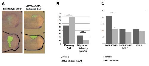 A) Isotopic and isochronic grafts of xlPTP4A3-depleted NC explants into host embryos showed a delayed NCC migration (b-b') when compared to the control histone 2b-GFP NC explants (a-a'). B) Timelapse videomicroscopy of stage 17-derived NCC treated with a pharmacological inhibitor of PTP4A3, a rhodanine derivative (PRL-3 inhibitor I), shows that inhibition of PTP4A3 increases the average of pausing NC cells and strongly decreases the migration velocity of the treated cells (relative to that of vehicle treated cells). The result is representative of three independent experiments and the average of counted cells is 60 cells per condition (***p<0,001). C) Timelapse videomicroscopy of uveal melanoma OCM1 cells stably expressing EGFP-PTP4A3, EGFP-PTP4A3(C104S) or EGFP on collagen I shows that inhibition of PTP4A3, using PRL-3 Inhibitor I, decreases specifically the migration velocity of the PTP4A3 expressing cells (relative to the velocity of untreated and control cells). The result is representative of three independent experiments and the average of counted cells is 50 cells per condition (***p<0,001).