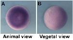 ptp4a3 (protein tyrosine phosphatase type IVA, member 3) gene expression in Xenopus laevis embryo, assayed via in situ hybridization, NF stage 9, animal view (left) and vegetal (right).