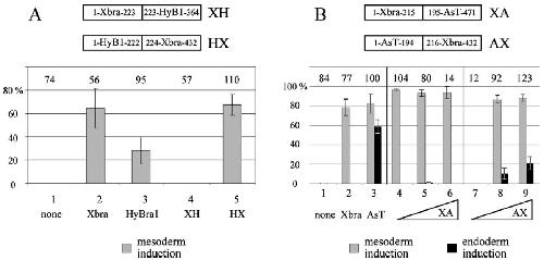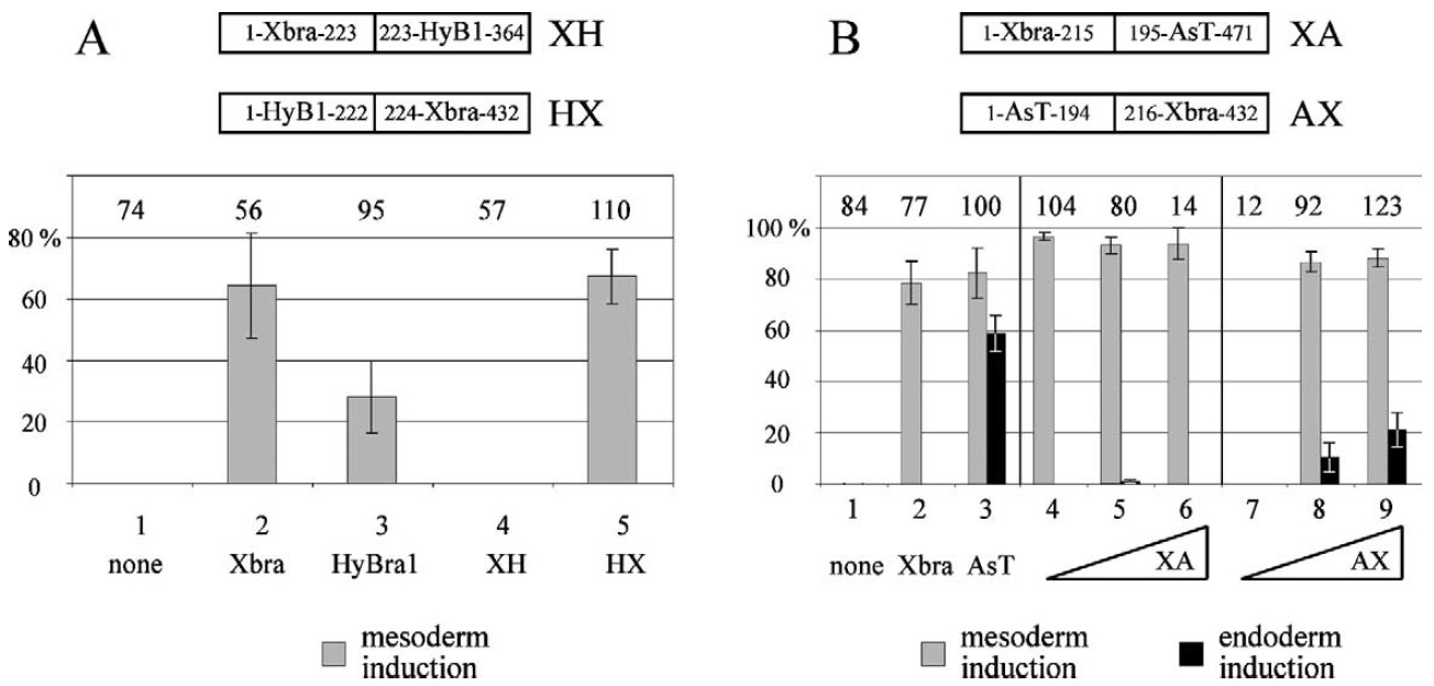 of endoderm positive caps. The numbers of assayed samples are noted above each bar. Injected doses of mRNA are: Xbra, 2 ng; As-T, 0.06â0.1 ng; XAX,